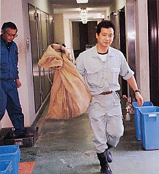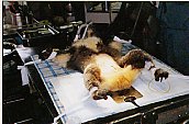 | (1)できるだけストレスを与えないよう、クミを麻袋に入れて、自動車ですばやく動物病院まで運びました。 |