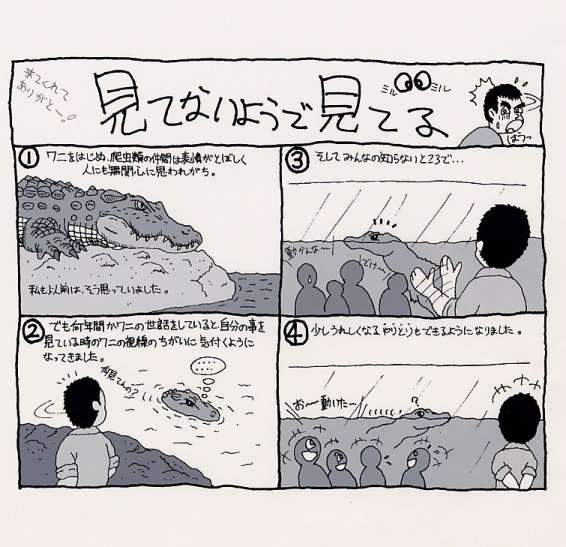 おそろしい爬虫類のイメージが先行するワニ。でも実は、頭が良く知的な一面を持っています。ワニは親子や仲間どうし、鳴き声でコミュニケーションをとるため、目で見るだけでなく、人の声や足音をも聞き分けます。担当飼育係が近ずいても気を許す温厚なワニでも、部外者が近ずくとおびえたり、怒ったりする事も多いのです。お客様の中を歩く私の足音を聞いて、眠っていたワニが目をさました事もありました。
